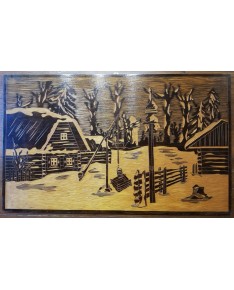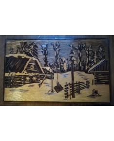 Ant medžio raižytas paveikslas kaimo tematika. Apie 1980 m., Matmenys: 70x42 cm